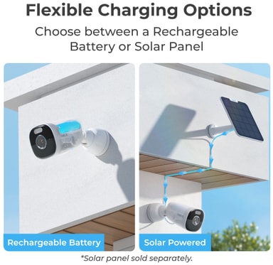 Kameran drivs av ett laddningsbart batteri med upp till 5 månaders batteritid. Du kan också ansluta en solpanel till den för nästan obegränsad strömförsörjning. Solpanelen säljs separat.