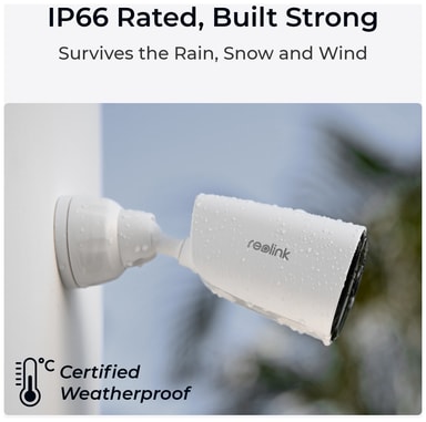 Den väderbeständiga IP66-klassningen skyddar din kamera från väder och vind.