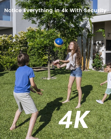 Den spelar in i levande 4K Ultra HD-färgbilder med exceptionell klarhet, både under dagen och i svagt ljus på natten. Du kan hålla koll på större områden tack vare dess breda synfält och förbättrade zoom. Den har också sensorlampor som aktiveras när rörelse upptäcks.