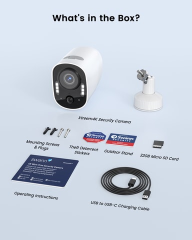 Swann Xtreem4K säkerhetskamera levererar enastående 4K Ultra HD-bilder även i svagt ljus. Dess färgseende på natten fångar tydliga bilder. Med tvåvägsljud kan du interagera i realtid, och den kraftfulla sirenen hjälper till att avskräcka inkräktare. TrueDetect+ kombinerar värme, rörelse och AI för att utlösa exakta varningar.