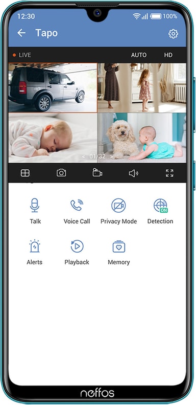 Ladda ner Tapo-appen och styr din kamera direkt i din telefon eller surfplatta. Granska dina inspelningar, använd tvåvägsmikrofonen eller stäng av kameran när du önskar. Appen är gratis och är tillgänglig för iOS- och Android-enheter. Du kan även aktivera röststyrning via Google Assistant och Amazon Alexa.