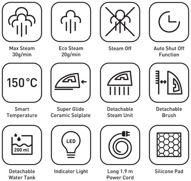 Enheten är byggd med ett ergonomiskt handtag och lätt konstruktion för bekväm användning under längre stunder. Den hållbara keramiska stryksulan ger överlägsen glidförmåga och jämn värmefördelning för säker och effektiv ångning.