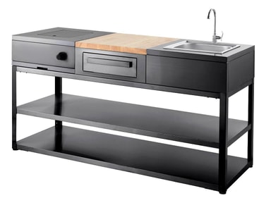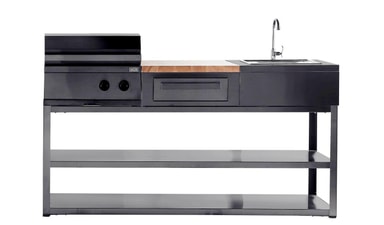 Basmodulen har en elegant svart design med stilrena raka linjer av rostfritt stål. En solid stomme som kan anpassas och kompletteras i olika utföranden, har två rymliga hyllplan som erbjuder stort utrymme att förvara grillredskap och andra kökstillbehör när till hands. Med basmodulen kan du kombinera allt från en gasolgrill, kolgrill, vask eller skärbräda i samma modul. Basmodulen kan även användas som fristående köksö och arbetsbänk, eller varför inte kompletteras till ditt befintliga kök med fler arbetsstationer att både förbereda, laga mat och servera från.