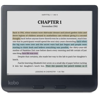 Njut av att läsa alla dina favorittitlar på den mycket förbättrade 7-tums E-ink Kaleido 3-färgskärmen, som erbjuder dig en upplösning på 1264 gånger 1680 pixlar med 300ppi i svartvitt och 150 ppi i färg. Med en imponerande 50 % förbättring i färgupplösning på e-sidor och PPI kommer dina böcker, serier och tidningar att sprängas till liv med ännu bättre färgprestanda och detaljer. Tack vare ComfortLight PRO-funktionen kan du enkelt justera ljusstyrka och färgtemperatur för att alltid passa ljusförhållandena i rummet eller utanför. Använd det mörka läget för att invertera svarta och vita färger för enkel läsning i mörker.