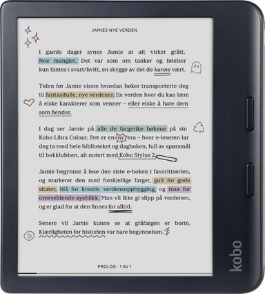 Ha alla dina favoritböcker med dig hela tiden tack vare kompakta och snygga Kobo Libra Colour läsplatta. 7-tumsplattan har en ny E-ink Kaleido 3 färgskärm med fantastiska optiska egenskaper. Skärmen ger dig hög kontrast, skärpa och låga svarstider. Upplev en helt ny nivå av läskomfort med den adaptiva ComfortLight PRO-funktionen, tekniken som hjälper till att justera skärmens ljusstyrka och färgton. Den moderna och eleganta designen erbjuder fantastisk hantering och rymmer ett långvarigt 2500mAh batteri, som kan hålla i upp till 40 dagar. Synkronisera alla dina e-böcker enkelt tack vare WiFi-anslutning och lyssna på dem via Bluetooth var som helst.