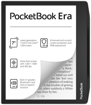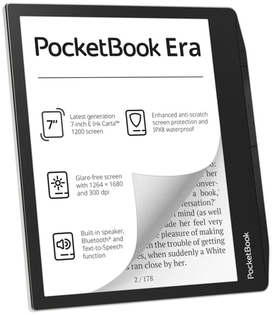 Läs alla dina favorittitlar på den eleganta och funktionsspäckade PocketBook Era eBook 16GB, med en 7-tums E-ink Carta 1200 HD+-skärm, inbyggd högtalare och Bluetooth-anslutning för text-till-tal och upp till en månads batteritid.Läs mer om produkten
