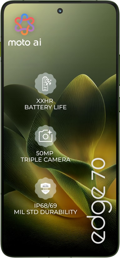 Motorola Edge 70-smartphone kombinerar snygg slimmad design, smidig prestanda och engagerande bildupplevelse tack vare AI-drivet kamerasystem, Snapdragon 7 Gen 4-processor, 4800mAh-batteri och stöd för trådlös laddning.Läs mer om produkten
