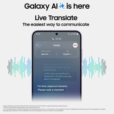 4. Live Translate kräver nätverksanslutning och Samsung-kontoinloggning. Live Translate är endast tillgängligt på den förinstallerade Samsung Phone-appen. Vissa språk kan kräva nedladdning av språkpaket. Tjänstens tillgänglighet kan variera beroende på språk. Resultatens korrekthet kan inte garanteras.