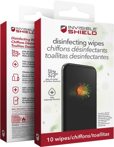 Zagg antimikrobiella våtservetter tar bort fläckar och kladd på din telefon, surfplatta eller dator. Förpackningen innehåller tio individuellt förpackade servetter som inte lämnar repor på din skärm.