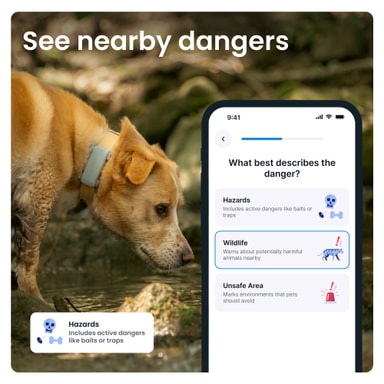 Använd Tractive GPS-appen för att hjälpa till att hålla samhället säkert. Med hjälp av kartan i appen kan du enkelt rapportera potentiella risker som gift, farliga områden eller vilda djur. Dessutom får du varningar om ditt husdjur närmar sig riskområden som rapporterats av andra användare.