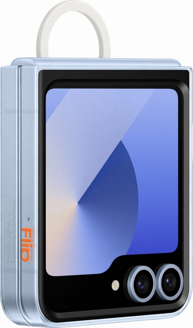 Visa din telefons eleganta design med genomskinliga Samsung Galaxy Z Flip6 fodral som skyddar mot fall och stötar. Fodralet har en inbyggd rem vilket gör det enkelt att hålla telefonen bekvämt i handen.