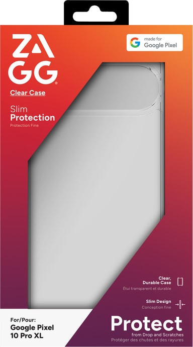 ZAGG Clear Case för Google Pixel 10 Pro XL erbjuder miljövänligt skydd med återvunnen plast, transparent design och perfekt passform för skärmar upp till 6,8 tum. Omslut din Pixel-enhet i ett klart men elegant yttre och skydda den mot repor.Läs mer om produkten