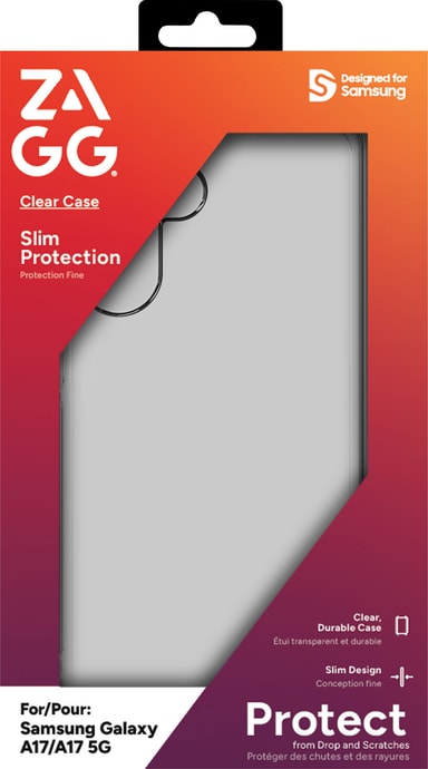 Zagg Samsung Galaxy A17/A17 5G-fodral erbjuder ett pålitligt, transparent skydd med enkel snäpp-på-montering, slank design med förstärkta kanter för fallskydd och kompatibilitet med trådlös laddning.Läs mer om produkten