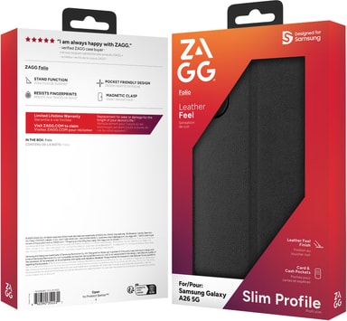 Pålitliga Zagg Samsung Galaxy A26 plånboksfodral håller din telefon skyddad i alla vardagssituationer. Detta slimmade, eleganta fodral är tillverkat av PU-läder och inkluderar kortplatser och ett praktiskt inbyggt stativ.Läs mer om produkten