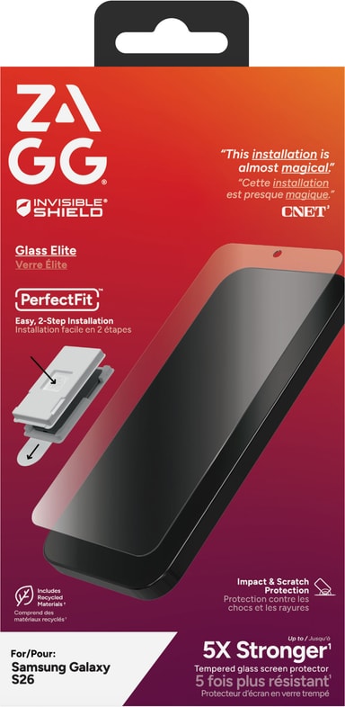 Zagg Glass Elite skärmskydd för Samsung Galaxy S26 ger pålitligt glasskydd med ClearPrint smutsmotstånd och PerfectFit-installation, vilket håller din skärm säker och klar samt ger enkel och exakt montering. Tillverkat av ultrastarkt aluminosilikatglas, Glass Elite är noggrant testat för att ge pålitligt skydd för din enhet.