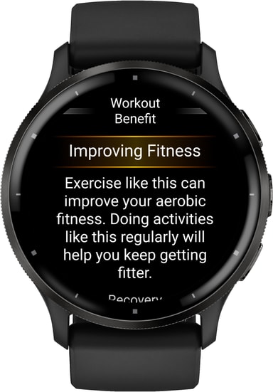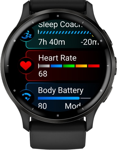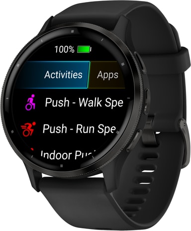 Denna smartwatch registrerar löpning, cykling, löpband, elliptisk träning, konditionsträning, yoga och andra aktiviteter. Den har 5ATM vattentäthet, så du kan bära den i poolen eller duschen. Kroppsbatterimonitorerna låter dig se din kropps energinivåer så att du vet när du är redo för aktivitet. Venu 3 har även rullstolsläge, pushregistrering och erbjuder förladdade träningspass specifikt för rullstolsanvändare. Tack vare den kostnadsfria smarta appen Garmin Coach kan du få personliga träningsplaner.