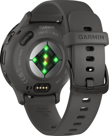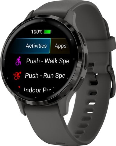 Denna smartwatch registrerar löpning, cykling, löpband, elliptisk träning, konditionsträning, yoga och andra aktiviteter. Den har 5ATM vattentäthet, så du kan bära den i poolen eller duschen. Kroppsbatterimonitorerna låter dig se din kropps energinivåer så att du vet när du är redo för aktivitet. Venu 3S har även rullstolsläge, pushregistrering och erbjuder förladdade träningspass specifikt för rullstolsanvändare. Tack vare den kostnadsfria smarta appen Garmin Coach kan du få personliga träningsplaner.