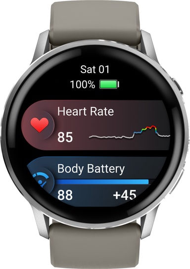 Med Garmin Venu 4 får du enkel tillgång till en omfattande översikt över din hälsostatus. Funktionen Fitness Age ger en uppskattning av din kropps ålder baserat på dina aktivitetsnivåer och hälsovärden.