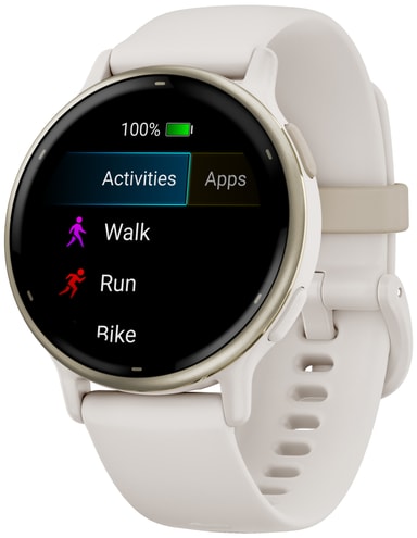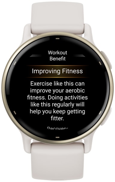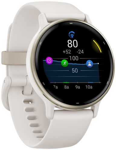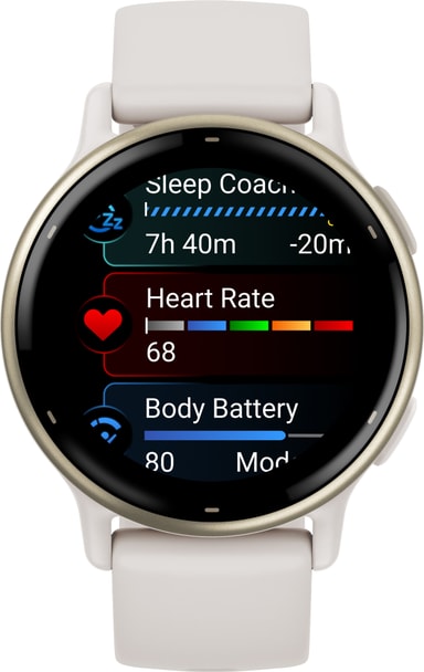 Smartklockan kan registrera promenader, löpning, cykling, konditionsträning, yoga och andra aktiviteter. Den är också simsäker och har 5ATM vattentålighet, så du kan fortfarande bära den i en pool eller dusch. Med batterimätarna kan du se kroppens energinivåer så att du vet när du är redo för aktivitet. Vivoactive 5 har också ett rullstolsläge som mäter rörelser och erbjuder förinstallerade träningspass som är specifika för rullstolsanvändare. Tack vare den kostnadsfria smartappen Garmin Coach kan du få personliga träningsplaner.