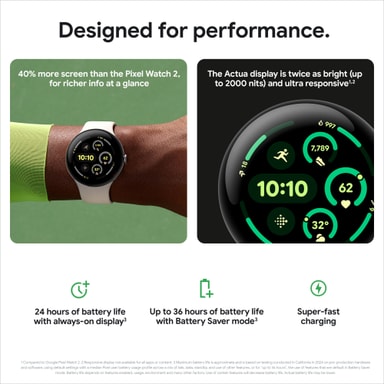 Google Pixel Watch 3 är designad för att prestera. Den helt nya Actua-skärmen är större, ljusstarkare och extremt responsiv. Slå ditt personbästa med avancerade löpfunktioner från Fitbit, och använd förbättrade funktioner för registrering av dagsform och konditionsträningsbelastning för att få rätt mängd vila. Håll även koll på dagens planer med hjälp av Google.