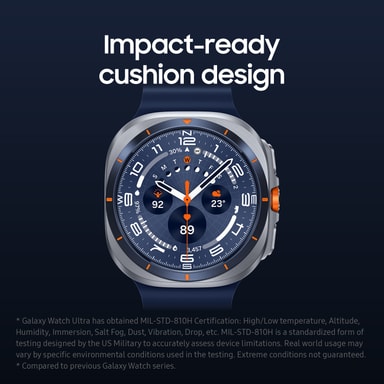 Byggd för att tänja gränser, Galaxy Watch7 Ultra tål upp till 55°C värme, 9 000m höjd, 10 ATM vattentryck och fungerar smidigt genom allt med en ny, kraftfull 3nm processor. Vandra längre med ett batteri som räcker upp till 100 timmar i energisparläge. Den nya BioActive Sensorn spårar dig noga och Galaxy AI ger insikter som vägleder dig att tänja dina gränser.