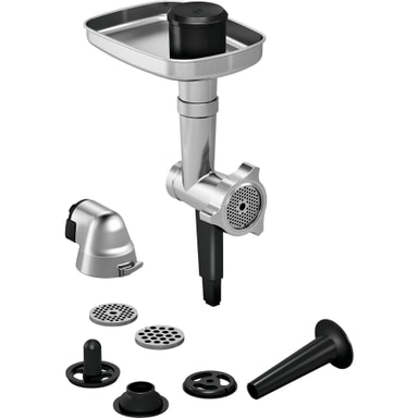 Mal kött, fågel eller fisk och gör korvar med hjälp av Bosch HuntersAdventure tillbehörsset MUZ9HA1 som passar OptiMUM köksmaskin. Tillbehörssetet innehåller en köttkvarn med adapter, 4,5 mm perforerad skiva i rostfritt stål, korvtillbehör, fyllningsbricka och påfyllare.