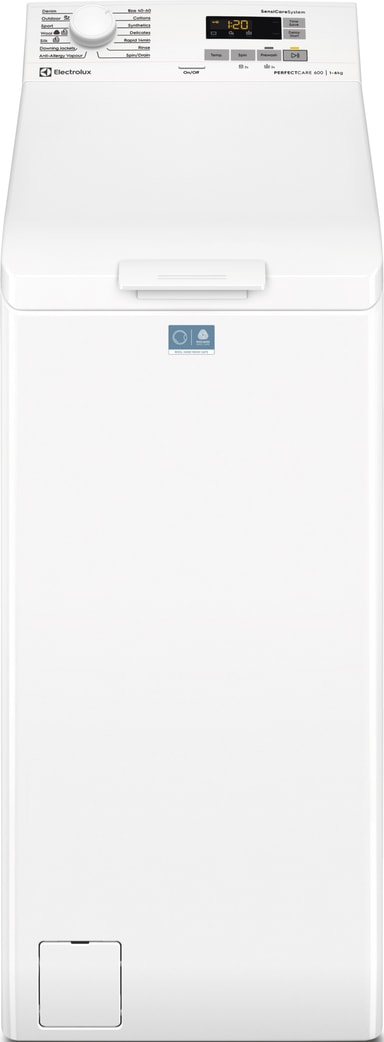 Den toppmatade 600-tvättmaskinen med SensiCare-system justerar programmets längd efter tvättmängd. Den använder rätt mängd vatten, tid och energi för att sköta kläderna, oavsett tvättens storlek. Kläderna bevaras dubbelt så länge.