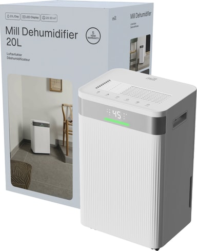 Mill luftavfuktare MDH20 passar rum på 20-30 m² och är perfekt för att torka kläder i källare. Den har en 4,5-liters vattentank, två fläkthastigheter, tre lägen (torr, auto, sömn), en LED-display, en timer och ett barnlås för enkel och säker användning.Läs mer om produkten
