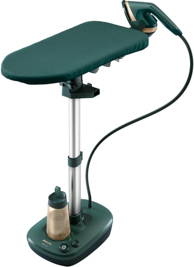 Det bärbara strykjärnet inkluderar en strykbräda med flera vinklar för vertikal och horisontell användning. Den har fotmanövrerade knappar för enkel på/av, en infällbar krok för att hänga upp kläder under strykning och hjul för enkel rörlighet.