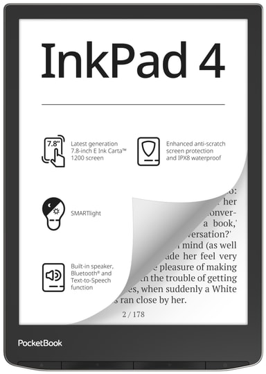 Läs dina favoritböcker på eleganta och funktionsspäckade PocketBook InkPad 4 eBook 32GB med 7,8-tums E-ink Carta 1200 HD+-skärm, inbyggd högtalare och Bluetooth-anslutning för text-till-tal. Upp till en månads batteritid.Läs mer om produkten