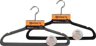Molly klädhängare är tillverkad av hårdplast med en yta som förhindrar att plagget glider av. Den slimmade designen tar upp väldigt lite plats i garderoben.