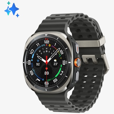 Samsung Galaxy Watch Ultra är byggd för extrema situationer – med ett titanhölje, safirglas och vattentålighet. TRegistrera sömn, träning och näring via Galaxy AI på en skarp 1,5-tums Super AMOLED-skärm, allt drivet av ett lång varande batteri.Läs mer om produkten