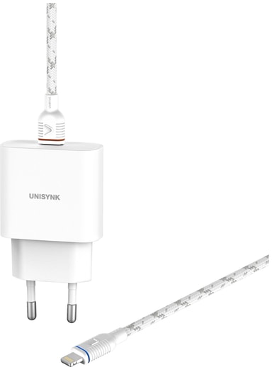 Unisynk 20W Lightning Slim väggladdare laddar din smartphone, surfplatta eller andra enheter med lätthet. Laddaren har en effekt på upp till 20W och laddar din smartphone från 0 till 50% på 30 minuter och stöder PD 3.0 snabbladdningsstandard. Den 2 meter långa förstärkta kabeln låter dig använda dina enheter bekvämt när du laddar. Levereras med Apple-certifierad MFi-kontakt.