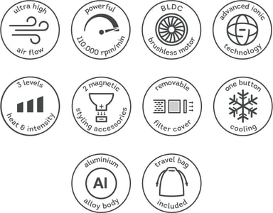 Motor: Hårtorken drivs av en 1800W BLDC borstlös motor.