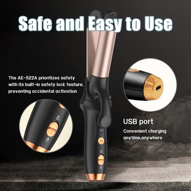 Säker och enkel att använda: Locktången erbjuder en säker användning tack vare sin inbyggda säkerhetslåsfunktion som förhindrar oavsiktlig aktivering. LED-displayen visar tydligt temperaturen, vilket möjliggör exakt värmekontroll. Dess ergonomiska design och sladdlösa funktionalitet gör den enkel och bekväm att använda.