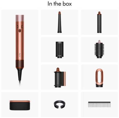 Inkluderar ett koniskt Airwrap-spole, 40 mm långt spole, anti-trassel loopborste, stor rund volymborste, snabbtork, tork+utslätare för flygigt hår, utredningskam, filterrengöringsborste och förvaringsfodral. Varje tillbehör är utformat för effektiva, salongsliknande resultat.