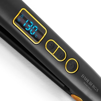 Få ett perfekt rakt hår med Dahlbergs Scandinavia Black Gold. Denna plattång har en digital LED-display med fem temperaturinställningar upp till 210°C, vilket gör den lämplig för de flesta hårtyper. Den keramiska beläggningen säkerställer en jämn värmefördelning och minskar slitage på håret. Plattången värms upp snabbt och har en automatisk avstängning efter en timme för extra säkerhet. Den 360° roterande sladden gör det enkelt att använda plattången utan att trassla. Designen i svart och guld ger ett sofistikerat utseende.