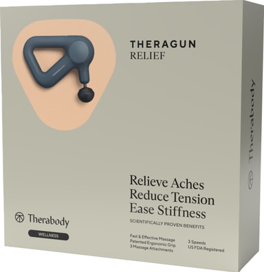 Lindra muskelsmärtor och axelvärk med Theragun Relief massagepistol från Therabody. Dess ergonomiska triangeldesign säkerställer enkel hantering, och de medföljande 3 fästena låter dig effektivt rikta in dig på olika muskelgrupper. En full laddning ger upp till 120 minuters kontinuerlig användning.