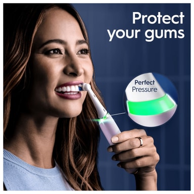 Oral-B iO 9s lär dig att applicera optimalt tryck tack vare sin smarta trycksensor som signalerar rött, vitt eller grönt ljus för att låta dig veta om du borstar lagom, för mjukt eller för hårt.