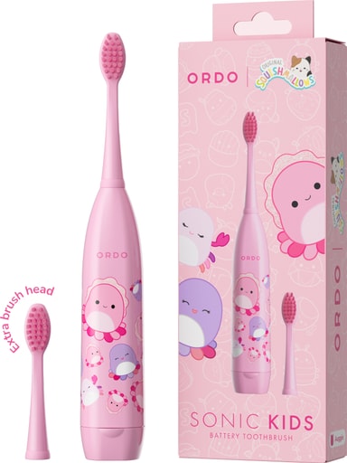 Ordo Sonic Kids eltandborste 44914 är designad för barn 4+. Den har ett ovalt borsthuvud för skonsam, effektiv rengöring, en inbyggd timer och en rolig Squishmallow-design för att göra borstningen rolig.Läs mer om produkten