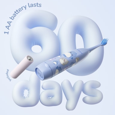Den elektriska tandborsten drivs av ett enda AA-batteri (medföljer tandborsten) och räcker i upp till 60 dagar.