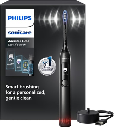 Philips Sonicare Advanced Clean elektrisk tandborste HX3792/11 använder sonisk teknologi för en skonsam och effektiv rengöring. En inbyggd display visar tid, tryck, batteri m.m. medan 5 borstlägen och en trycksensor skyddar tandköttet.Läs mer om produkten