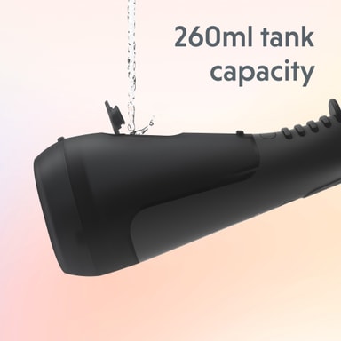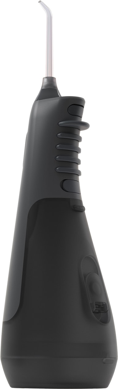 Vattenflossern har en 260 ml vattentank och en böjd, räfflad design med ett smalt munstycke för precis rengöring. Bekvämt placerade tryckinställningar och strömknappar på framsidan säkerställer enkel kontroll.