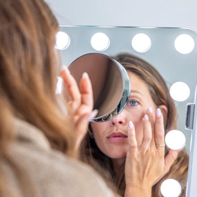 Använd det löstagbara förstoringsglaset för att fixa eyelinern eller ta bort irriterande pormaskar.