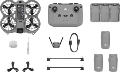 DJI Neo 2 Fly More-drönarsetet har en lätt design på 151 g som spelar in 4K/100 fps-video med en 2-axlig gimbal. Den har hinderdetektering i alla riktningar, ActiveTrack, 49 GB internminne och 10 km O4+-överföring. Fly More Combo innehåller två extra batterier, en laddningshub och ett fodral.