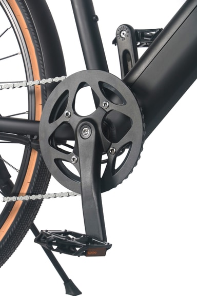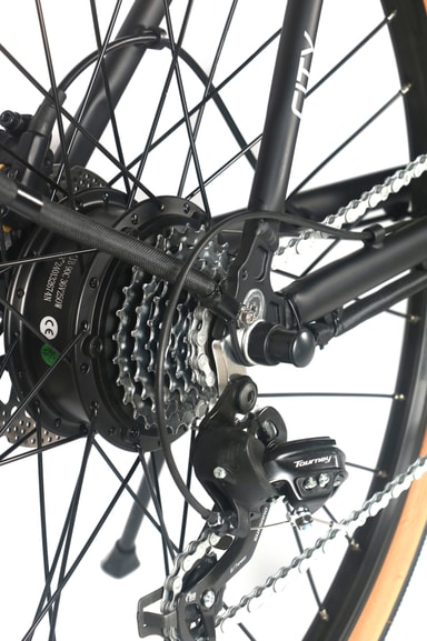 Denna elcykel har en 250W borstlös tandad motor som når en maximal hastighet på 25 km/h.