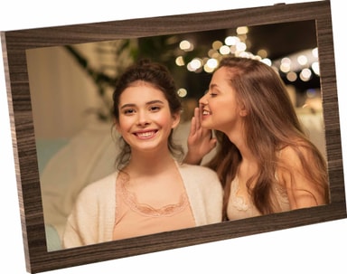 Design: Den enkla bruna ramen med träfinish passar perfekt in i de flesta dekorer, oavsett om det är på ditt sängbord, på en hylla i ett kök eller på väggen i ditt vardagsrum. Ramen är väggmonterbar tack vare ett VESA 100-fäste och den har ett litet stativ på baksidan också. Utöver det kommer Frameo med en inbyggd klocka och kalender samt ett schema på/av för att inte störa dig på natten. Håll dina minnen nära.
