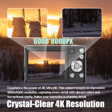Kristallklar 4K-upplösning: Upplev kristallklar 4K Ultra HD bild- och videokvalitet. Den här kameran har en imponerande upplösning på 8000x6000, som fångar varje detalj med livfulla färger och exceptionell klarhet.