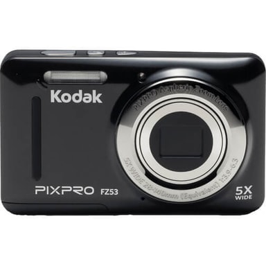 Kodak pixpro fz53 kompakt 5x . 5x optisk zoom. 16mp sensor. 720p hd-video. Smal och kompakt design. 28mm vidvinkellins. 2,7"""" lcd5x optisk zoom kodak pixpro fz53 erbjuder en generös 5x optisk zoom i en tunn och kompakt design. Ta med denna användarvänliga kamera och fotografera var du än går, och zooma in så nära du behöver. 28mm vidvinkellins få med hela bilden med detta praktiska 28mm vidvinkelobjektiv. Komponera bilden eller videon du vill ta. Du kommer att bli förvånad över enkelheten och prestandan som denna trevliga zoomkamera har. Ansiktsigenkänning det här är inställningar som gör skillnaden i dina foton. Lätt att använda och tillgänglig i kamerans meny, välj helt enkelt på för att aktivera ansikts-, leende- och blinkningsfunktioner med fz53 f zoom. Koppla sedan av och ha kul utan att oroa dig för att missa det perfekta bilden. Minnesvärda stunder för de tillfällen när bilder inte är tillräckligt, kan fz53 även spela in 720p hd-video så att du kan fånga alla händelser - stora eller små. I förpackningen kodak pixpro fz53 svart uppladdningsbart litiumjonbatteri ac-adapter usb-kabel vristband specifikationer [35 mm filmekvivalent] [28 mm (bred) 140 mm (tele)] bländare: f3.9 (bred) - f6.3 (tele) ström: li-ion-batteri mått (bxhxd): 9,2 x 5,6 x 2,3 cm