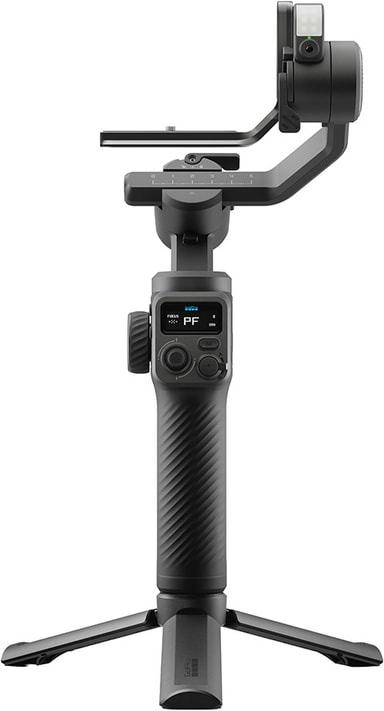 GoPro Fluid Pro AI gimbalstabilisator erbjuder ultrastabil filmning med 320° lutning och obegränsad 360° panorering, och stödjer kameror och tillbehör upp till 400g. Den inkluderar utbytbara fästen för mobiltelefoner, GoPro och kompaktkameror, plus en AI-spårningsmodul för exakt motivföljning. Funktioner inkluderar ett integrerat fyllnadsljus, trådlösa kamerakontroller och ett långvarigt batteri med USB-utgång för laddning av enheter.